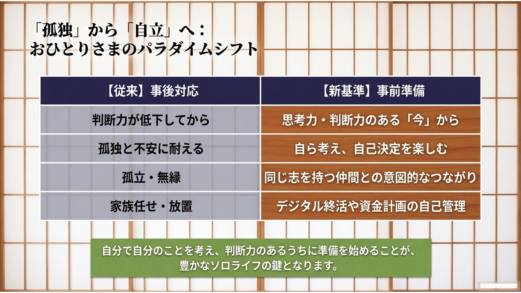 ~たとえ今家族がいても、家族の中で最終的に生き残った人は「おひとりさま」になってしまうので、自分で自分のことを考え、判断力のあるうちにこれからの「おひとりさま」について考えていく必要があるのではないか。~